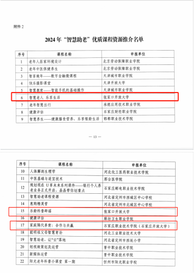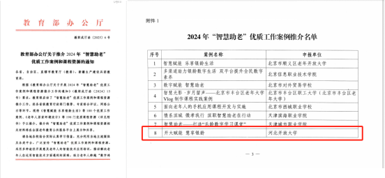 近日,教育部辦公廳公布2024年“智慧助老”優質工作案例和課程資源推介名單。經過嚴格評審,全國范圍最終遴選出100個具有示范意義的優質工作案例。其中,河北省推介的20個案例中有3個成功入選。我校社區教育學院柴瑜(團隊成員:李慶東、郭勝、劉艷輝、常德正)負責撰寫的“開大賦能 慧享銀齡”案例憑借其創新性與實踐成效脫穎而出,入選2024年國家級“智慧助老”優質工作案例。