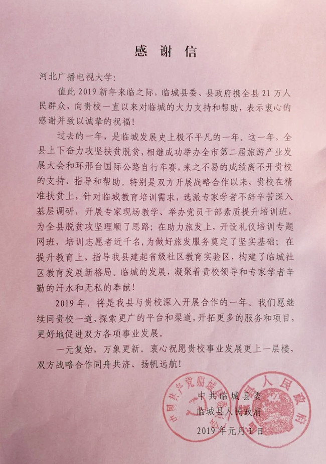 一元復始,萬象更新,值此2019新年來臨之際,臨城縣委、縣政府向我校發來感謝信!