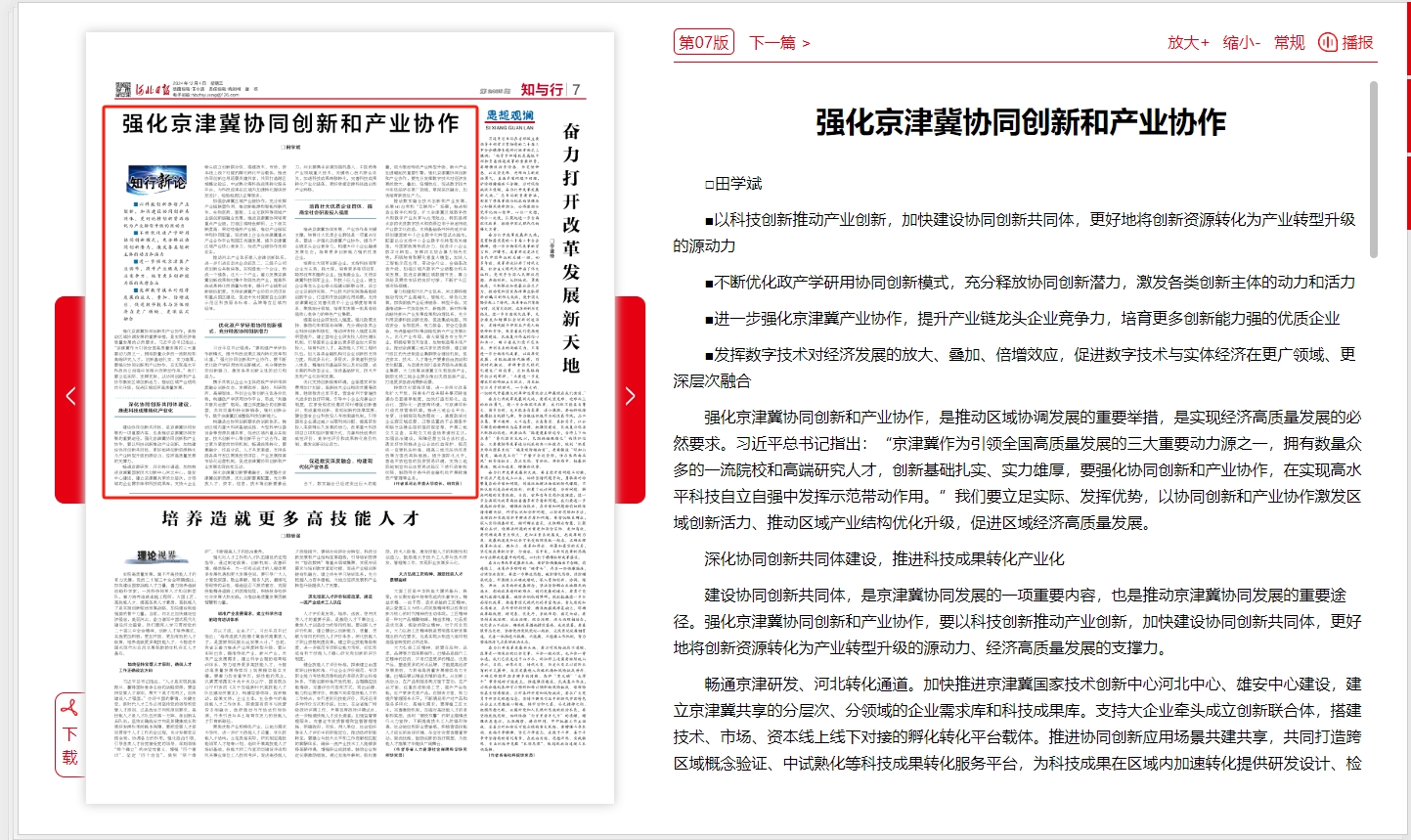 12月4日,我校黨委副書記、校長田學斌在《河北日報》“知與行”理論版發表題為《強化京津冀協同創新和產業協作》的署名文章。
