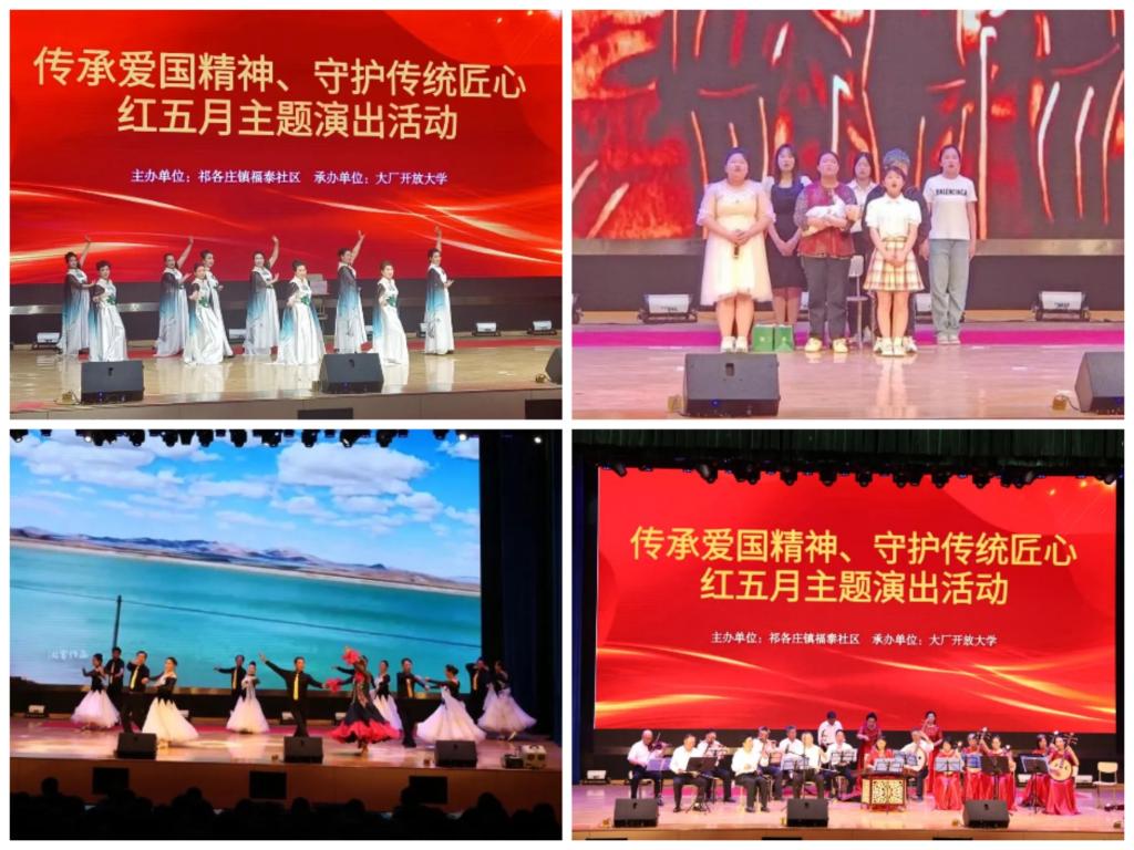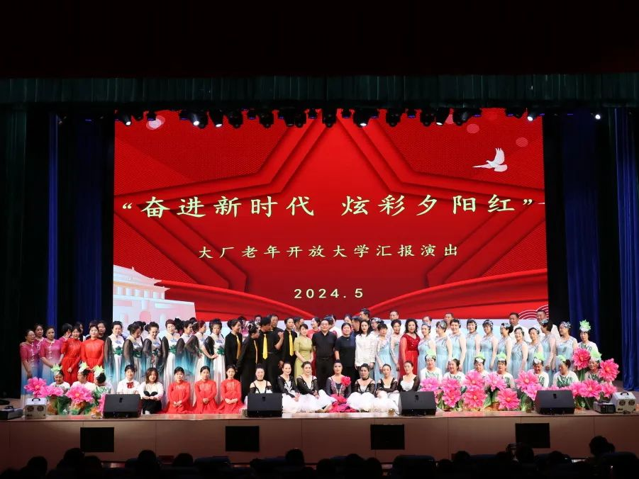 為貫徹落實黨中央、國務院和省政府關于發展老年教育的要求,踐行全民終身學習理念,展示廣大老年學員的精神風采,為廣大老年學習型團體和學員提供一個展示風采的舞臺,大廠老年開放大學福泰社區教學點于5月17日上午,在大廠開放大學報告廳隆重舉行以“傳承愛國精神,守護傳統匠心”為主題的教學成果匯報演出。大廠開放大學徐宏偉副校長、王雙艷副校長、福泰社區黨支部王海蘋書記、老年學員及職中師生共300余人參加活動。