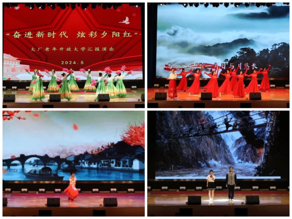 大廠福泰社區教學點的老年學員們精神飽滿,身著盛裝,表演了包括民樂合奏、朗誦、歌曲、音樂劇、大合唱、舞蹈、運動表演等14個節目。節目形式多樣、精彩紛呈,充分展現了老年學員們的精神風貌和大廠老年開放大學的教學成果。