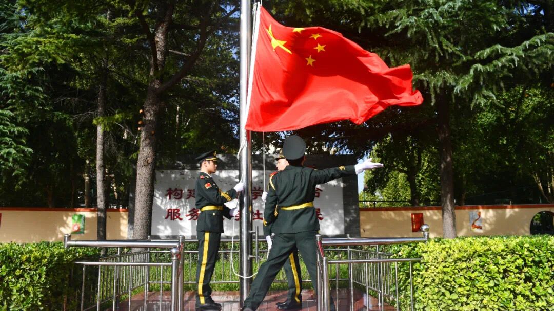 迎著朝陽(yáng),升旗儀式正式開始。三名護(hù)旗手邁著矯健的步伐,護(hù)送鮮艷的國(guó)旗走向旗臺(tái)。在雄壯激昂的國(guó)歌聲中,五星紅旗冉冉升起。全體師生肅立,行注目禮,表達(dá)對(duì)祖國(guó)的無(wú)限敬意和無(wú)比熱愛。