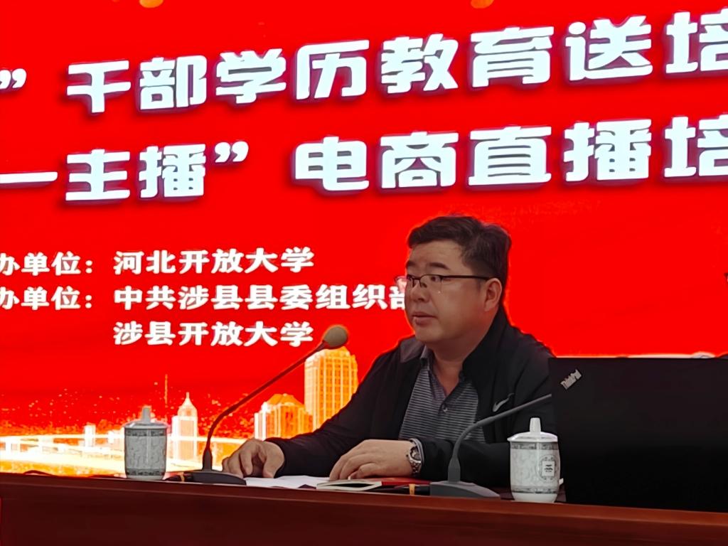 在第二會場,涉縣開放大學聯合縣委組織部,開展河北開放大學送培下鄉活動暨“一村一品一主播”電商直播培訓,全國工商聯人才中心專家庫專家特聘講師、北京交通大學工商管理碩士、《石門論電》百期公益電商沙龍創始人高光澤老師親自授課,他深入剖析了農村電商在鄉村振興中的重要性和潛力,結合實際案例分享了農村電商的運營策略和成功經驗,還針對農村電商中常見的問題和挑戰提供實用的解決方案和指導。學員們通過本次講座,對農村電商的發展趨勢、運營模式、營銷策略等有了更加清晰的認識,對今后在農村電商領域的發展充滿了信心。縣委組織部副部長韓曉宏出席活動并作了重要講話。