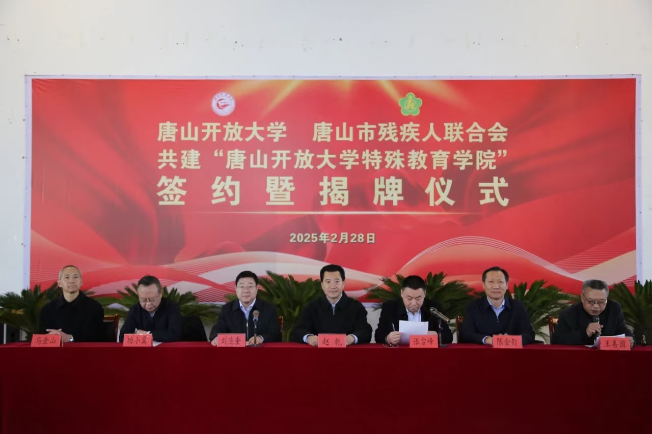 2月28日,唐山開放大學特殊教育學院簽約暨揭牌儀式在唐山市殘聯舉行。唐山市委教育工委專職副書記趙乾,唐山開放大學黨委書記張雪峰,唐山市殘聯黨組書記、理事長劉連奎,唐山開放大學校長陳金釘,唐山開放大學副校長楊小冀,唐山市殘聯黨組成員、副理事長王善國,唐山市殘聯二級調研員馬金山等出席儀式。各縣(市、區)殘聯副理事長,唐山開放大學科級以上干部,唐山市殘聯機關、教育中心、就業中心、體管中心全體人員,醫療中心負責同志以及陽光學校的全體師生等參加儀式。