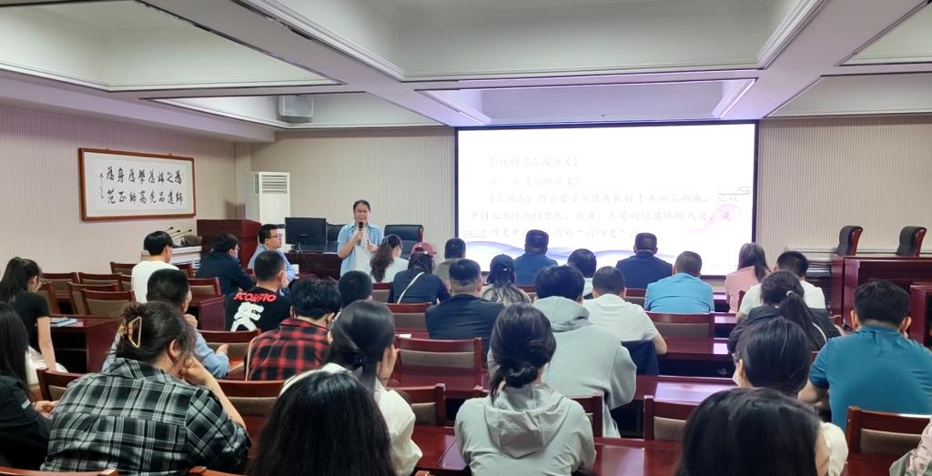 主講教師賈翊坤為大家帶來了“文學在身邊”的主題講座。賈翊坤老師以曹操為切入點,結合邯鄲十大文化脈系之一的建安文化脈系,為同學們帶來生動、形象、真實的文學素養課程。授課過程中賈老師引用了陳壽、白壽彝、易中天等名家大師對曹操的解讀,并拓展到建安七子,為同學們展示了一個立體、豐滿的歷史人物形象。