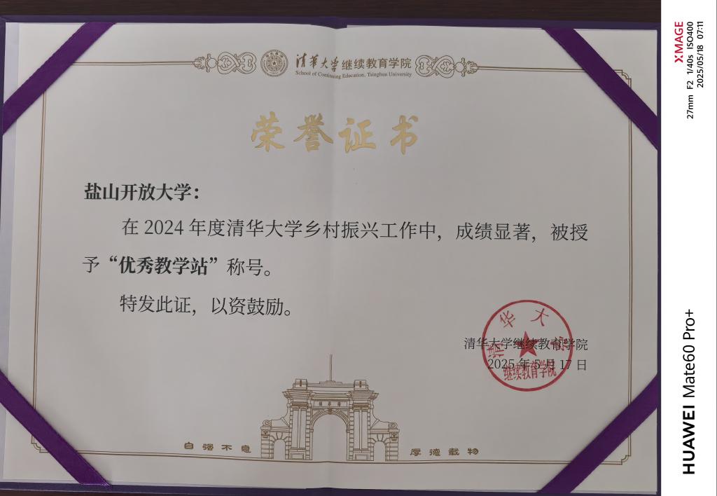 日前,根據清華大學繼續教育學院下發的《2024年清華大學鄉村振興人才培訓優秀組織單位、優秀教學站和先進個人擬表彰對象公示》的通知,滄州鹽山開放大學被評為2024年清華大學鄉村振興人才培訓優秀教學站。