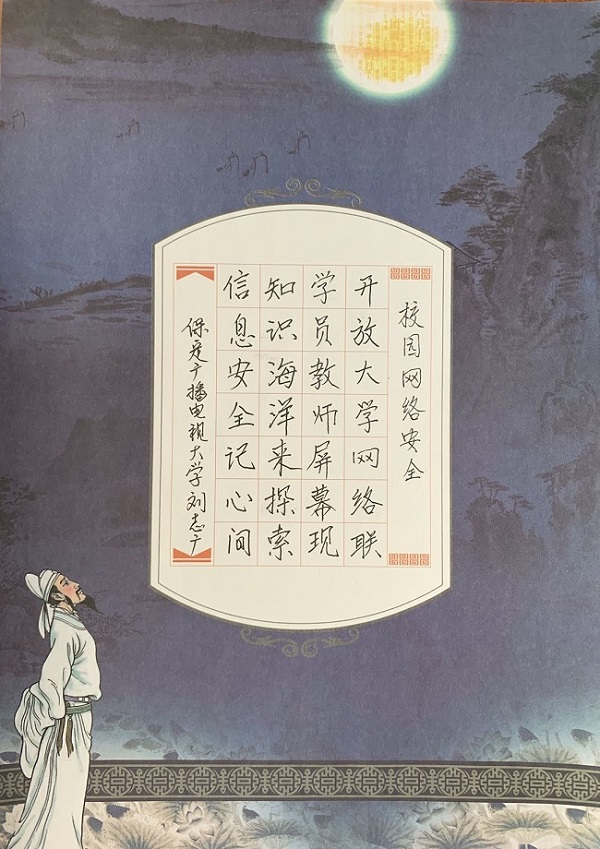 此次活動旨在通過形式活潑、內容豐富、時效性強的線上線下活動,面向廣大師生開展網絡安全宣傳教育,提升師生的網絡安全意識和風險防范能力,營造安全健康文明的校園網絡環境。宣傳周活動期間,保定電大校園網主頁進行“國家網絡安全宣傳周”專題宣傳;電子屏幕滾動播出宣傳周主題標語及相關視頻;組織師生進行網絡安全答題。同時保定電大積極組織“網絡安全在我身邊”校園作品征集活動,廣大教師踴躍參與創作,共征集作品20余份,題材包括微視頻、微網文、微書畫等,涉及網絡安全法宣傳,防范網絡詐騙、網絡暴力,做好網絡防護等多方面內容。