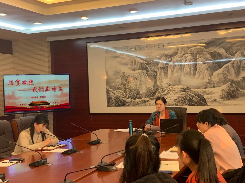 培訓會上,趙校長通過對十九大報告中“三大攻堅戰”、“兩個百年奮斗目標”、黨的十九屆五中全會精神以及河北省“三個圓滿收官”精神解讀,向大家闡釋了脫貧攻堅的重大意義。接下來,她結合2020年國際國內形勢,深刻剖析中國所面臨的挑戰與機遇,鼓勵大家從自身做起,敢于擔當、踏實做事,高質量、高水平地完成各項工作。最后,趙校長分享了自己2018年上半年對唐縣、淶源21個貧困村進行扶貧專項督查時的工作日志,向大家展示了一幅幅扶貧一線感人至深的畫面。58歲依然奮斗在脫貧攻堅一線的李書海隊長,以扶貧工作為主題創作劇本、歌曲的曹津生隊長,為殘疾群眾申請國家資助、從精神和物質上關愛孤兒的史洪祿隊長,工作兢兢業業卻疏于照顧家人的胡慧敏夫婦......一句句溫暖樸實的話語、一個個催人奮進的故事,在場人員無不為這些默默無聞奮斗在扶貧一線的人物所感動。