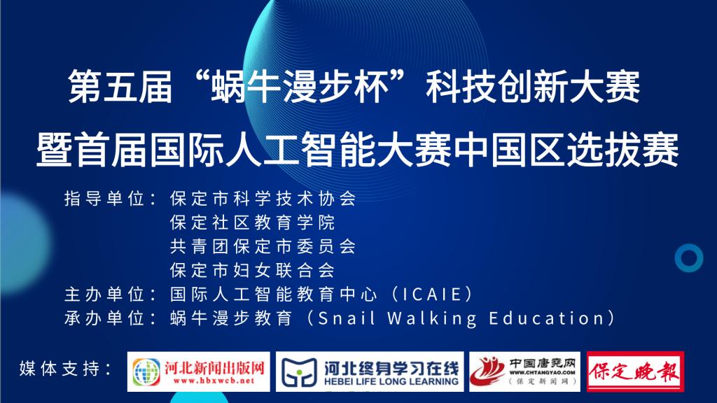 蝸牛漫步教育作為保定社區教育學院實踐基地,每年年末都會舉辦“蝸牛漫步杯”科技創新大賽。今年,蝸牛漫步教育作為國際人工智能教育中心(ICAIE)戰略合作伙伴,得到國際人工智能大賽(IAIC)獨家授權,承辦了首屆國際人工智能大賽中國區選拔賽,并與第五屆“蝸牛漫步杯”科技創新大賽合并舉辦。本次大賽各項目設冠軍及一、二、三等獎,項目冠軍將獲得明年8月在新加坡舉辦的國際人工智能大賽總決賽的選拔推薦。
