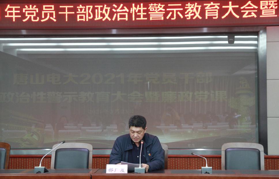 3月23日下午,唐山電大在遠教樓學術報告廳組織召開2021年黨員干部政治性警示教育大會暨廉政黨課。校黨委書記、校長郝廣友,黨委委員、副校長牟景文,黨委委員、紀委書記吳萬林,副校長李春儒出席會議,學校部長以上干部及全體黨員參加會議。會議由黨委委員、綜合辦公室主任王愛榮主持。