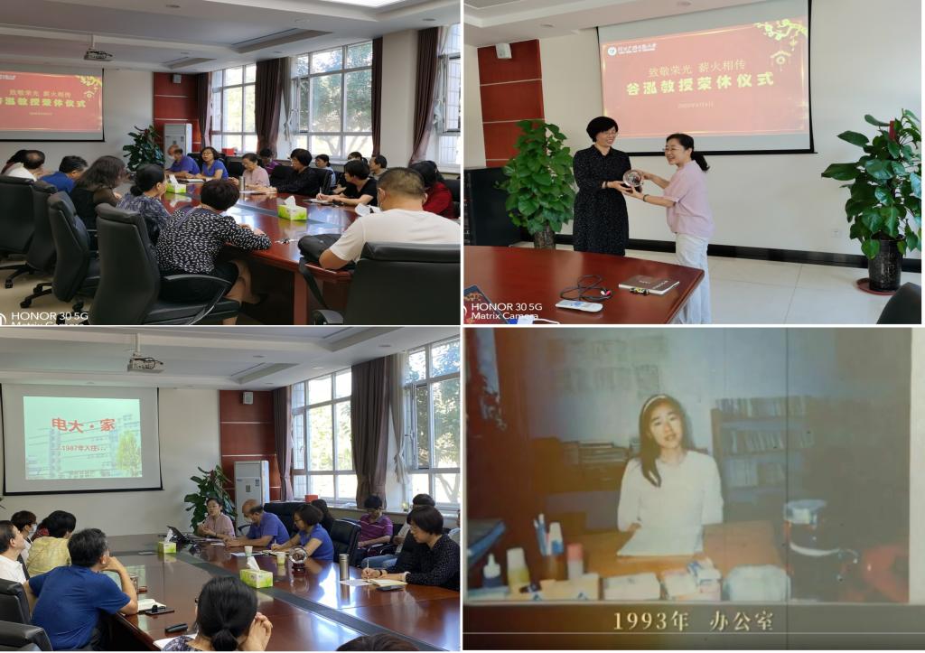 儀式上張淑蓮作了熱情洋溢的致辭,她代表全體教師向光榮退休的谷泓教授致以最崇高的敬意,并送上最真摯的祝福!教學(xué)支持部黨總支書記郝風(fēng)武為谷泓教授頒發(fā)了榮休紀(jì)念品。谷泓教授在發(fā)言中表示,感謝部門為退休教師組織榮休儀式,她回顧了自己三十六年的教師生涯,一張張溫馨的老照片承載了無數(shù)珍貴的回憶,成為她永遠(yuǎn)銘記、永遠(yuǎn)為之驕傲的職業(yè)體驗(yàn)。她表示,退休后將繼續(xù)關(guān)注學(xué)校事業(yè)發(fā)展,在教學(xué)、科研以及對(duì)年輕教師的“傳、幫、帶”中發(fā)揮余熱。教師們與谷泓教授開懷暢談、熱情交流,并精心錄制小視頻,為谷泓教授送上美好祝福!