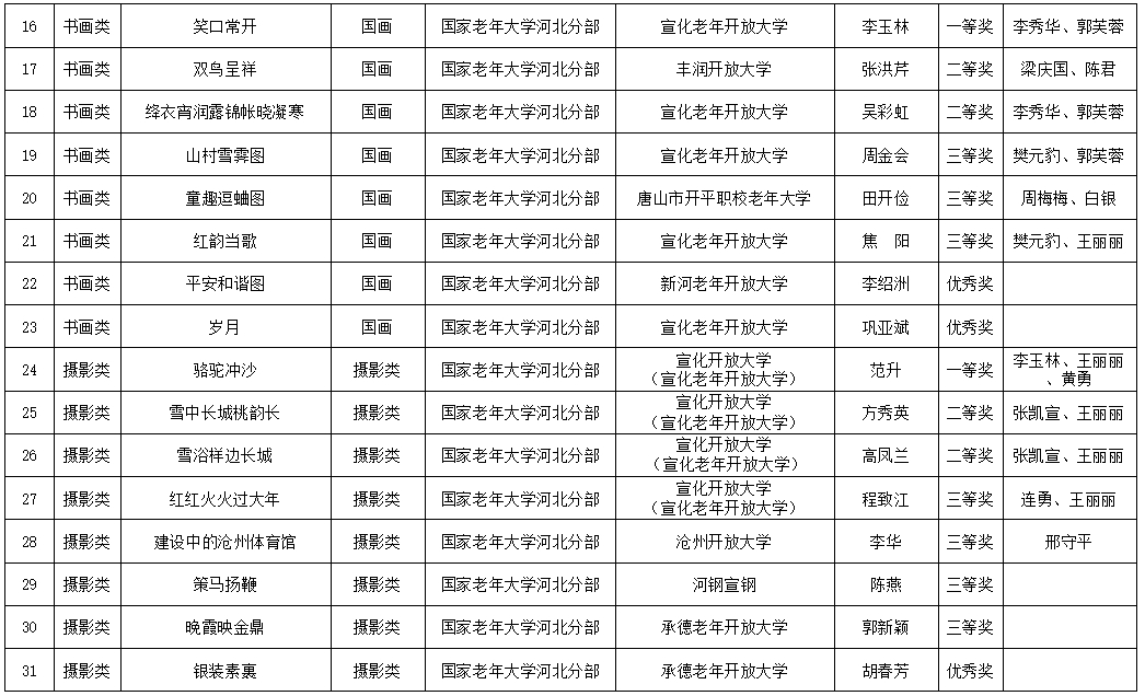 近日,國家老年大學(xué)陸續(xù)公示了2024年全國老年教育各類教學(xué)成果展的評選結(jié)果,國家老年大學(xué)河北分部報送的作品中,有31項(xiàng)獲獎,包括書畫類15幅,攝影類8幅,器樂類4項(xiàng),合唱類3項(xiàng),舞蹈類1項(xiàng),另評選出優(yōu)秀指導(dǎo)教師26人。其中,宣化老年開放大學(xué)書畫類作品《隸書·錄成公綏隸書體》《笑口常開》、攝影類作品《駱駝沖沙》喜獲一等獎。